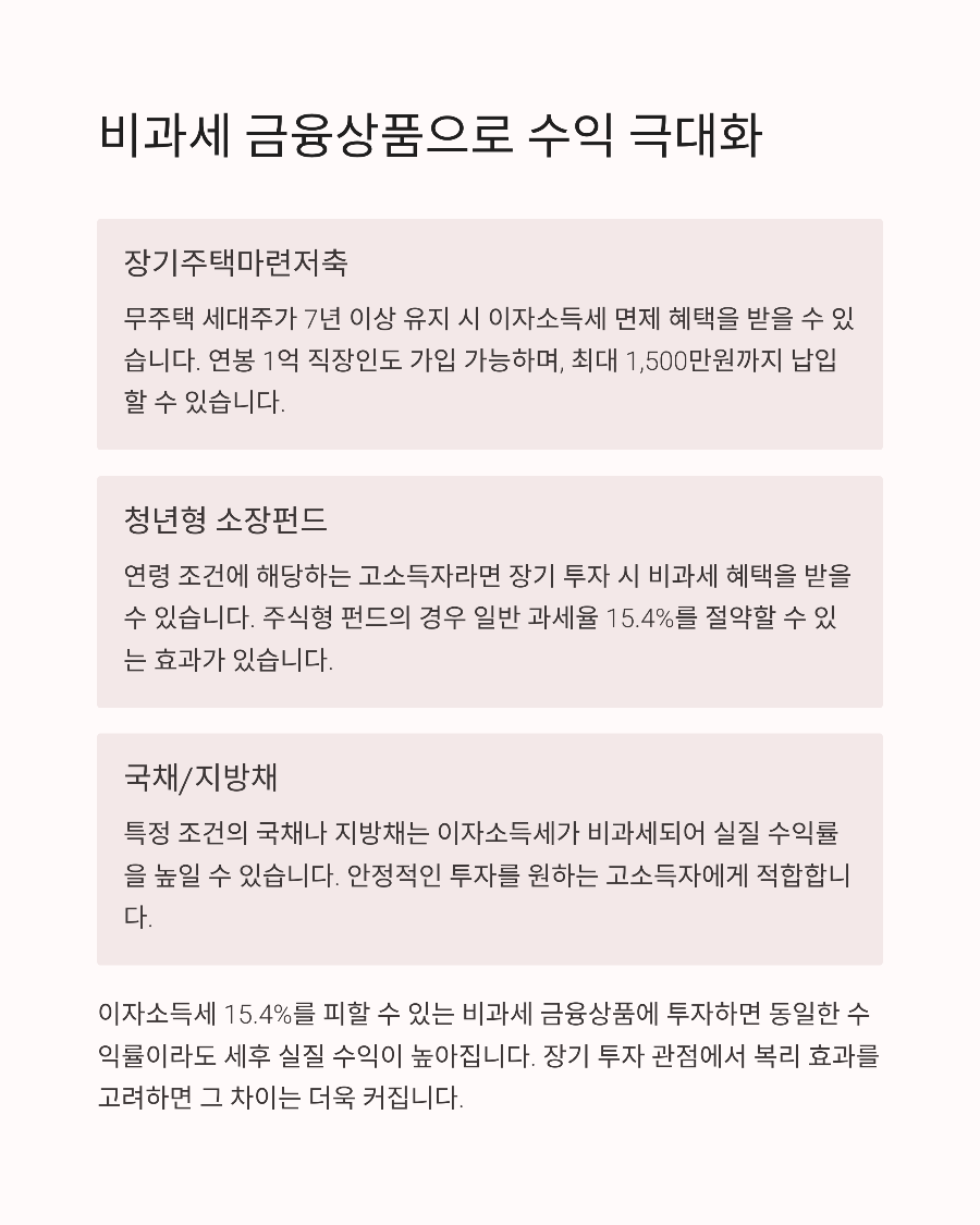 이처럼 세금이 적은 금융상품을 활용하면 세후 수익률이 높아져 실질 자산 증식에 유리합니다.