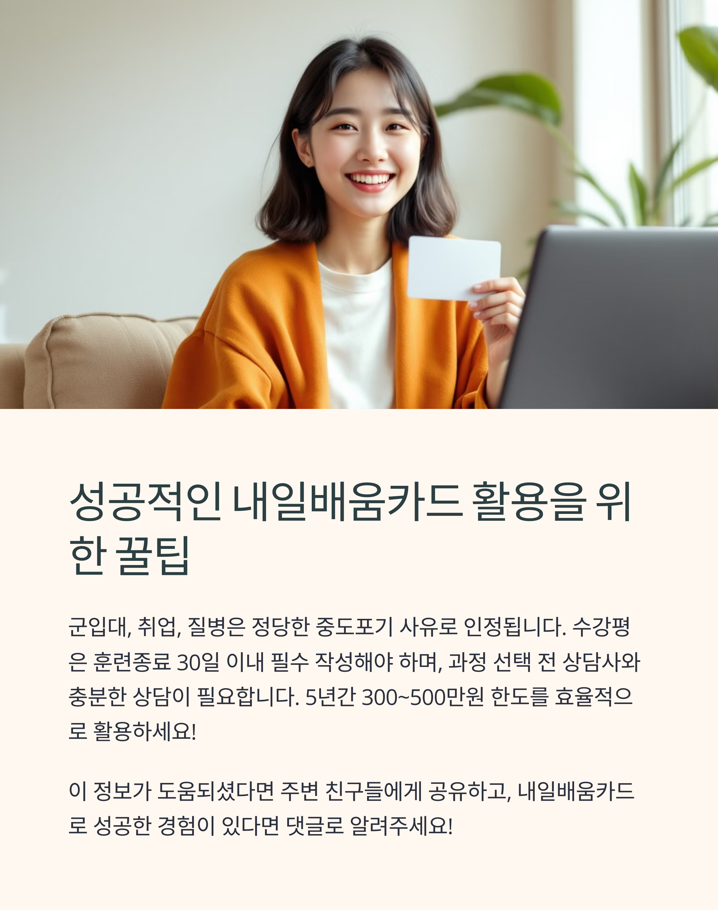 내일배움카드는 하나의 기회예요. 그리고 기회는 준비된 자에게 주어지죠. 기본적인 사항만 지켜도 수료율은 훨씬 높아지고, 혜택은 최대한 받을 수 있어요. 성공적인 수강 경험은 결국 계획적인 준비에서 나오는 거랍니다! 🚀