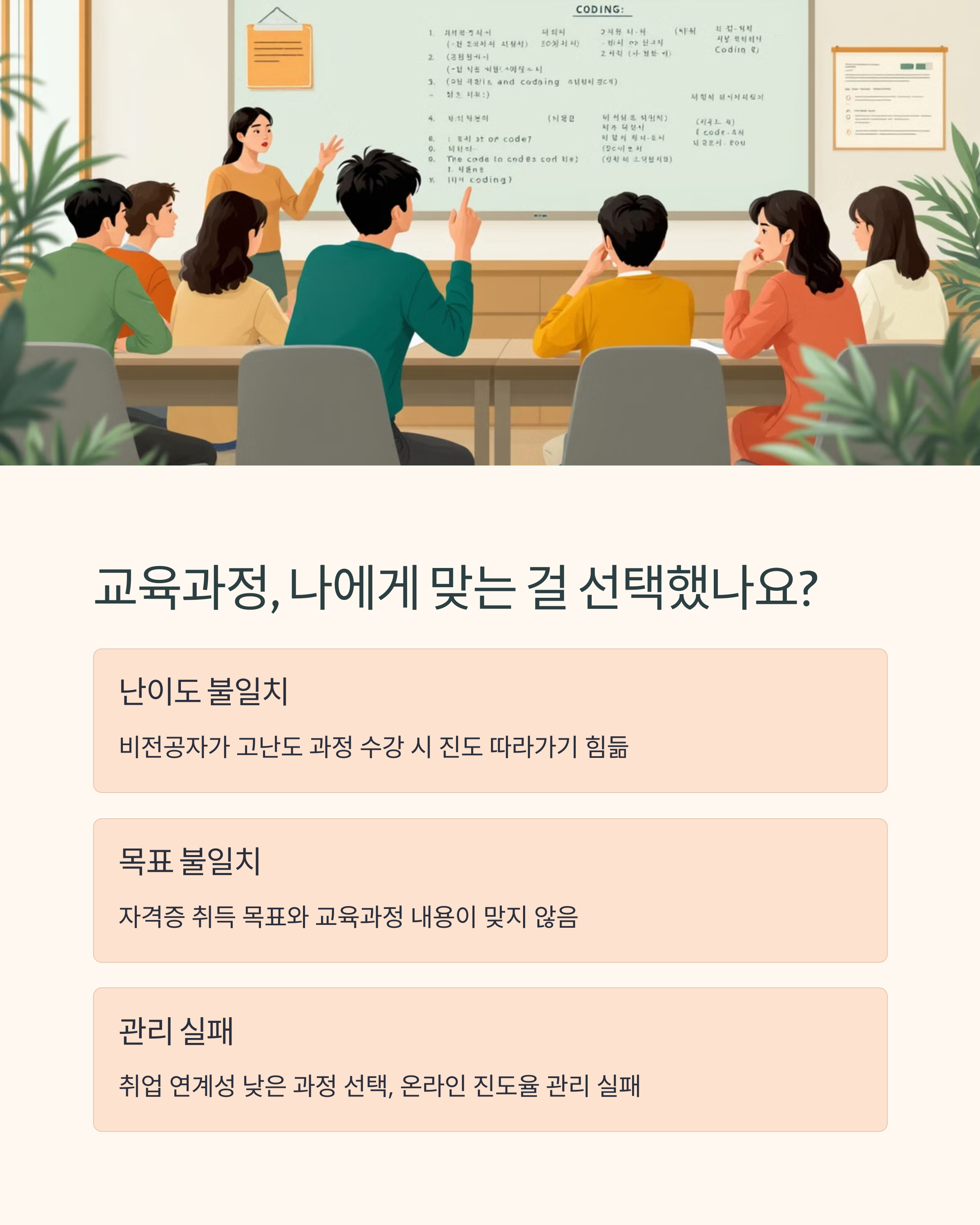 수업을 들었지만 출석률이 기준 미만이거나 시험을 보지 않고 포기하는 것도 모두 중도포기로 처리돼요. 이게 결국 다음 과정 신청 시 불이익으로 이어지기 때문에 정말 신중하게 생각해야 해요.
