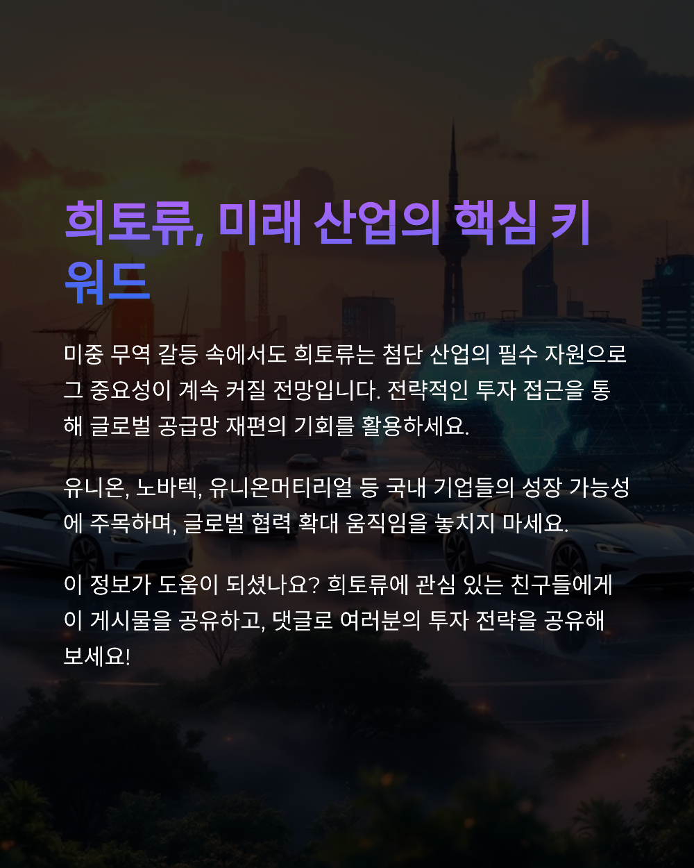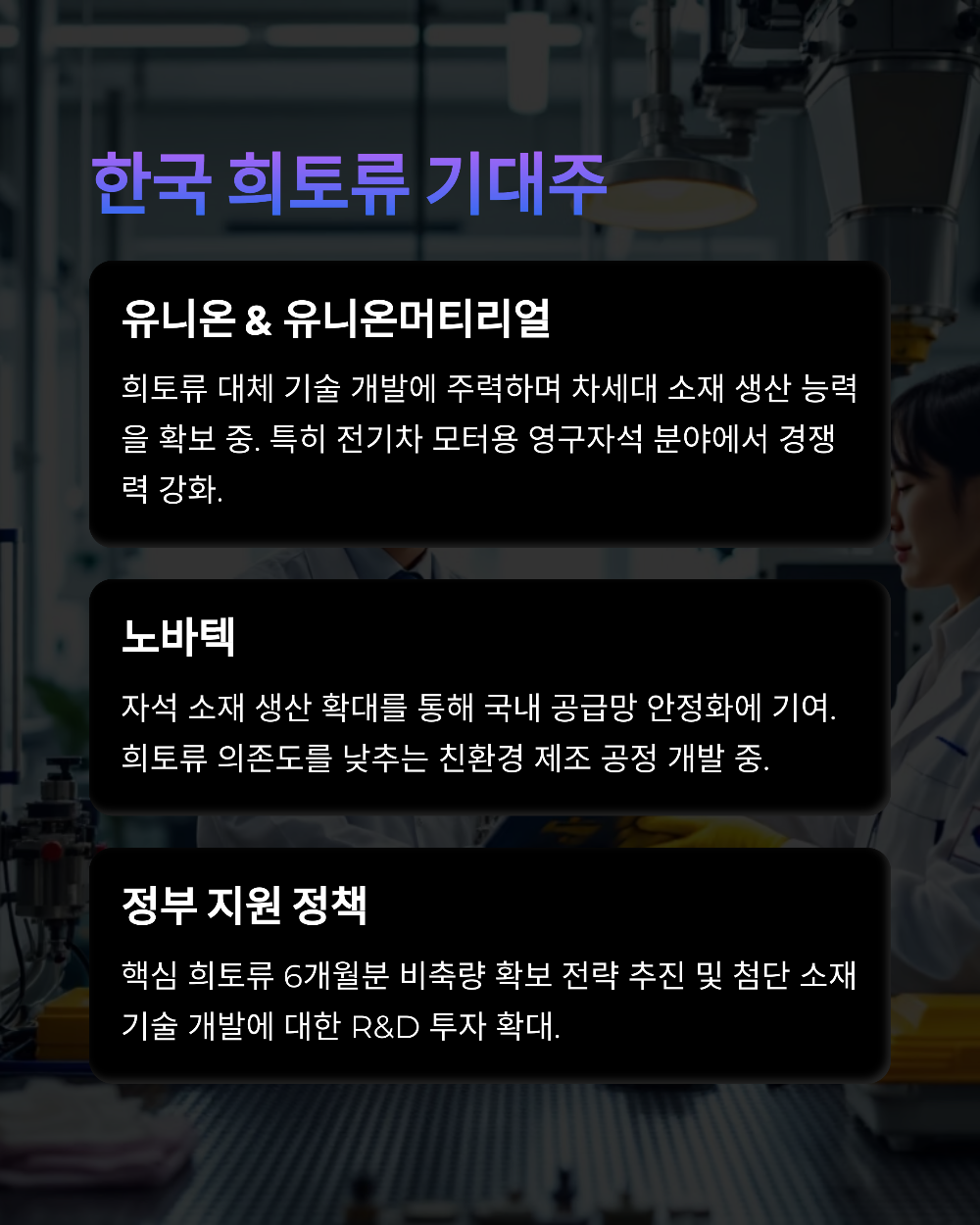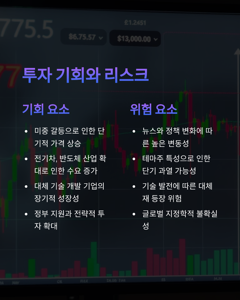 • 희토류 관련주는 지정학적 리스크(예: 미중 갈등)에 직접적으로 영향을 받아요.