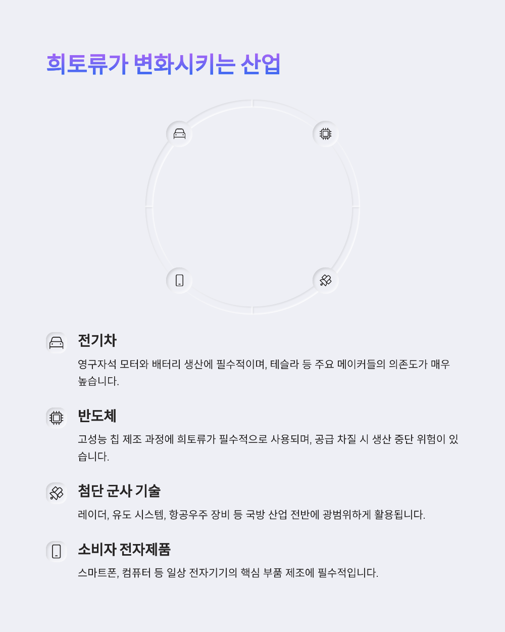 희토류는 일상생활에서 쉽게 볼 수 없지만, 스마트폰, 전기차, 풍력발전기, 군사용 미사일까지 없는 곳이 없을 정도로 꼭 필요한 자원이에요. 총 17가지 금속 원소로 구성되어 있으며, 이들 각각은 특정 기술에 맞춤형으로 사용되고 있어요. 희토류는 단단히 감춰진 현대 산업의 기초재라고 할 수 있죠.