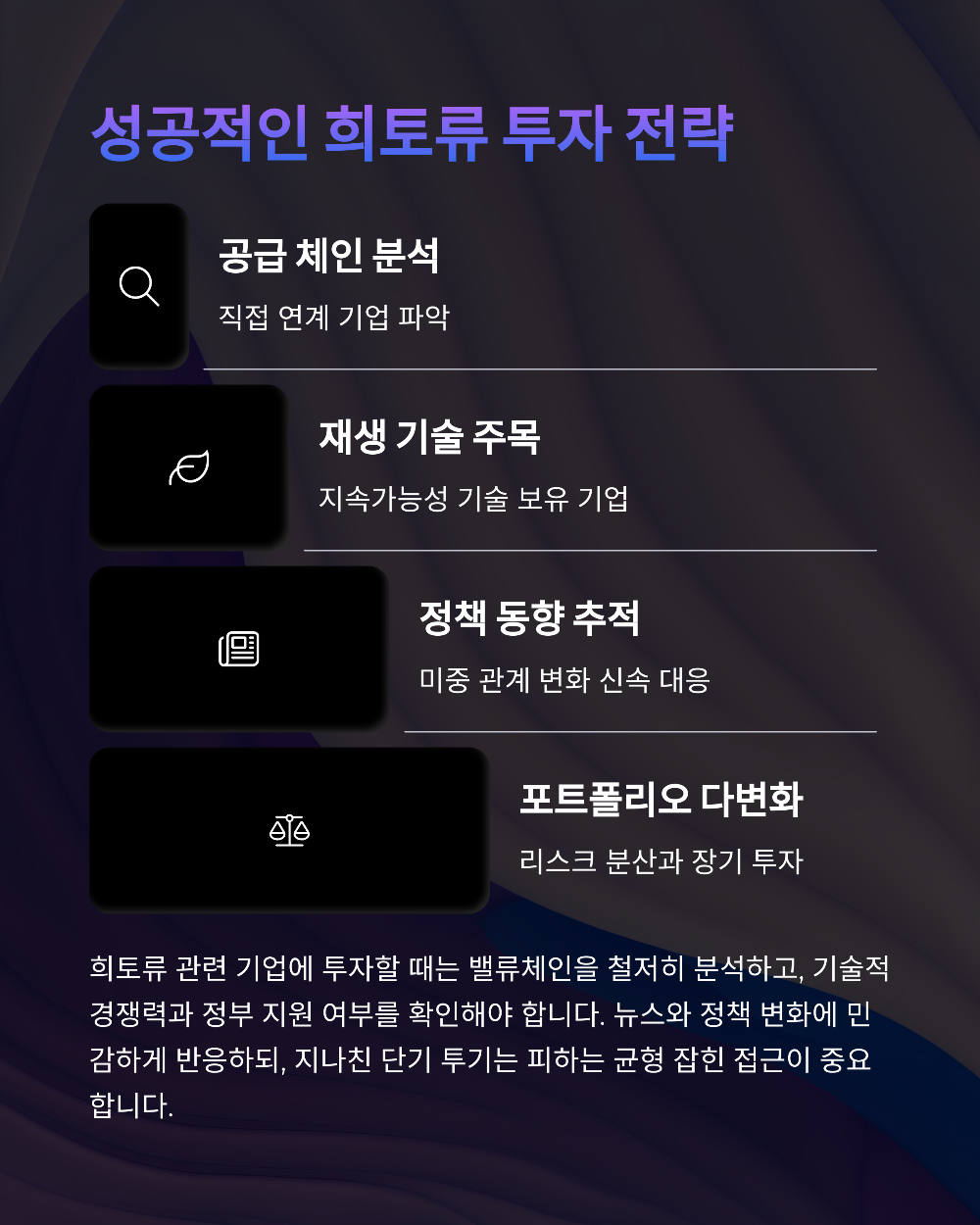다만, 희토류 관련주는 변동성이 크고 이슈에 민감한 테마주 성격이 있기 때문에 투자 시 아래와 같은 점을 꼭 기억해야 해요. 특히 실적이 안정적이지 않은 종목일수록 분산투자와 분할매매 전략이 효과적이에요.