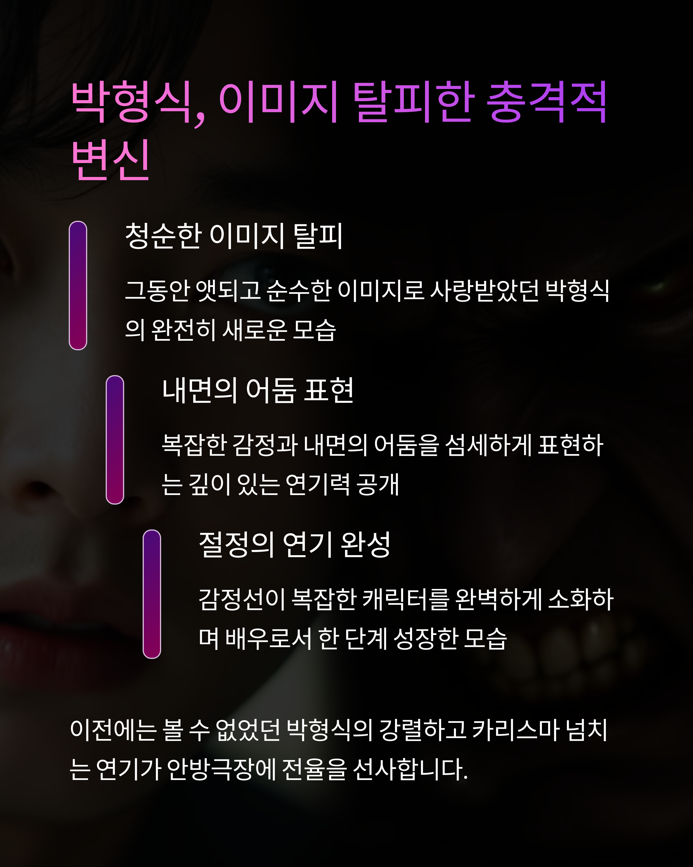 특히 연기력 면에서 가장 큰 찬사를 받은 배우는 단연 박형식이에요. 그동안 부드럽고 밝은 이미지였던 그가 이번에는 다크하고 차가운 캐릭터로 완벽하게 변신했어요. 냉철하지만 내면에는 깊은 상처를 가진 서동주 역을 섬세하게 그려냈고, 눈빛 연기만으로도 시청자들을 몰입시켰어요.