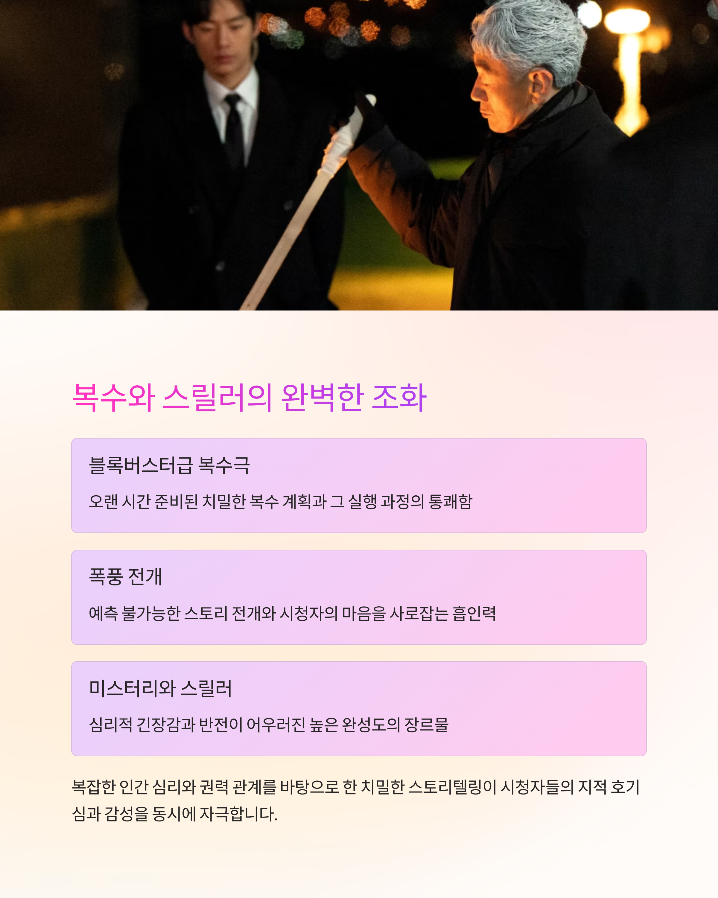 처음에는 '또 하나의 복수극일까?' 생각할 수 있지만, 시간이 갈수록 인물 간의 심리전과 반전, 그리고 연기력의 향연이 몰입도를 점점 끌어올려요.