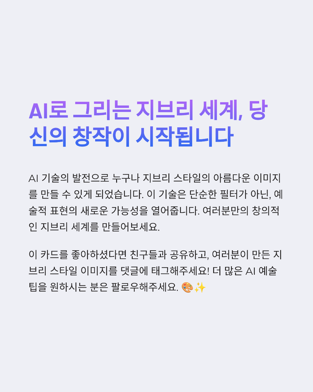 📌 오늘 소개한 AI 툴들을 활용하면, 여러분도 감성 넘치는 지브리 애니 스타일 이미지를 누구보다 쉽게 만들 수 있어요. 무료 툴부터 고퀄 툴까지 다양하게 소개해드렸으니 하나씩 체험해 보면서 나만의 ‘애니메이션 컷’을 완성해 보세요! 😊