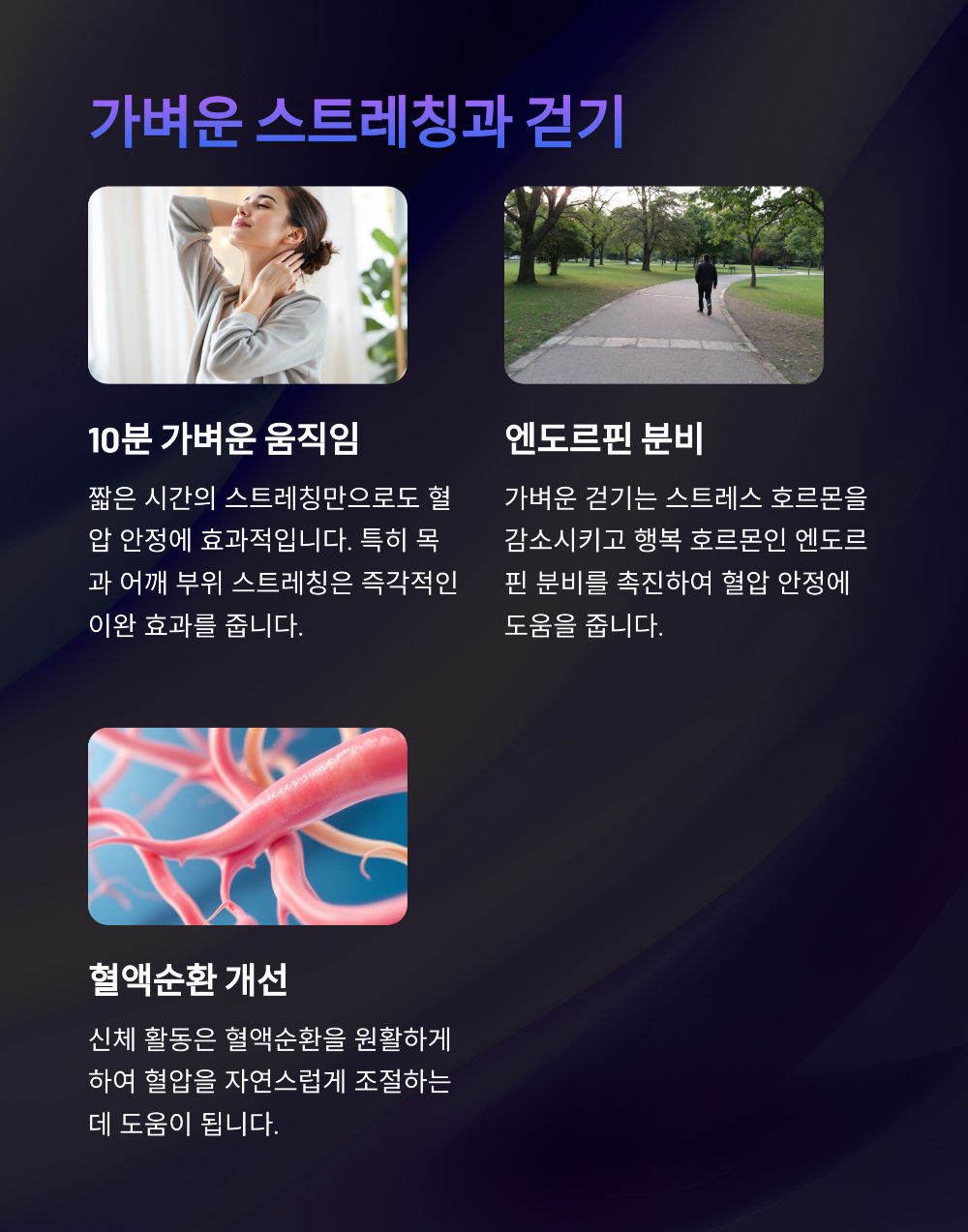 제자리걸음, 계단 천천히 오르기, 가벼운 스트레칭 등은 근육을 자극해 혈액순환을 활발하게 하고, 결과적으로 혈압도 낮추는 데 도움을 줘요. 단, 격한 운동은 오히려 자극이 될 수 있어서 피해야 해요.