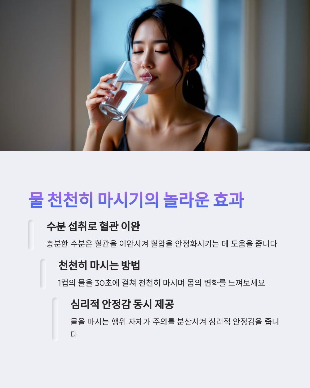 물은 한 번에 벌컥 마시기보다는 천천히 마시는 것이 더 좋아요. 마시면서 심호흡을 함께하면, 부교감신경의 자극이 배가되어 혈압을 안정시키는 데 더 효과적이에요. 하루 8잔 이상 수분을 유지하는 것도 장기적으로 혈압 관리에 도움이 된답니다.