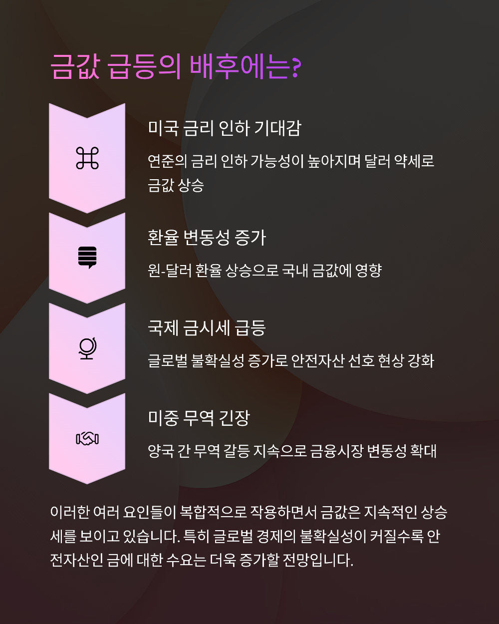 A4. 미국의 금리 인하 기대감, 국제 금값 급등, 환율 상승, 지정학적 리스크 등 여러 요인이 복합적으로 작용했기 때문이에요.