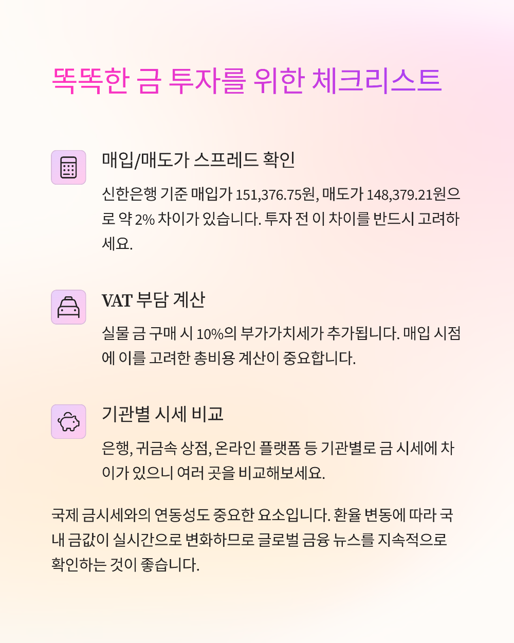 그럼 이제 금을 직접 투자할 때 어떤 점들을 고려해야 하는지 살펴볼 차례예요!💡 매입/매도 차이, 세금, 시세 비교 등 중요한 포인트를 정리해 볼게요!