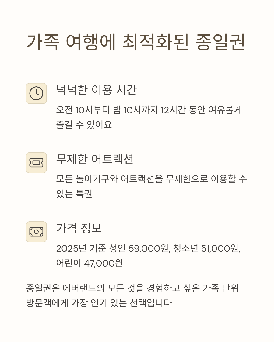 종일권은 하루 종일 이용 가능한 만큼 모든 놀이기구, 공연, 전시 등을 여유롭게 즐길 수 있어요. 특히 어린 자녀와 함께 방문하거나 에버랜드가 처음인 분들에게는 최고의 선택이에요.