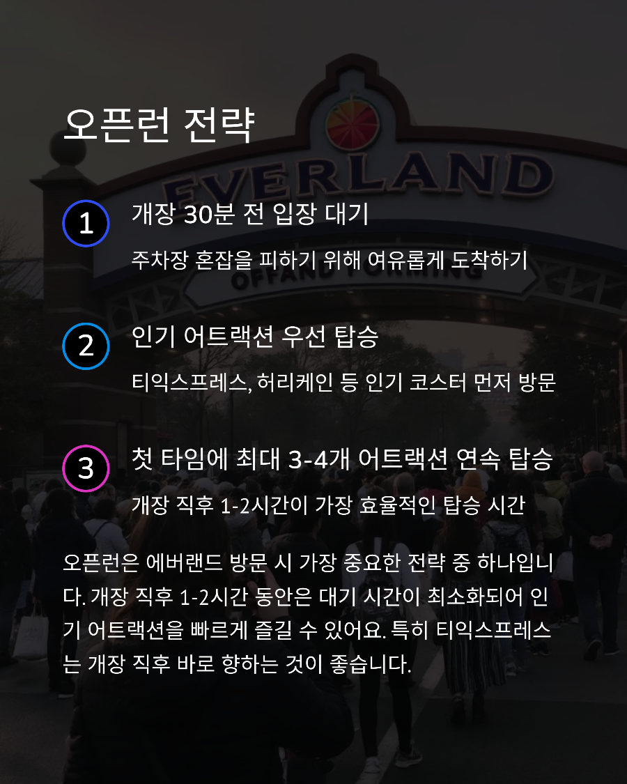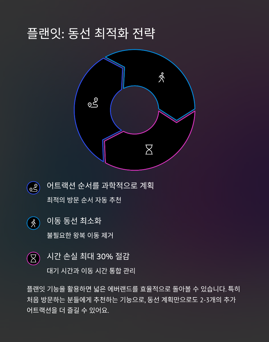 입장 당일엔 오픈런이 제일 중요해요. 개장 시간보다 20~30분 일찍 도착해서 대기하고 있다가 입장하면, 가장 인기 있는 어트랙션을 줄 없이 탈 수 있어요. 입장하자마자 바로 스마트줄서기 1회 차부터 신청하고, 큐패스나 플랜잇으로 예약된 기구로 이동하면 퍼펙트!