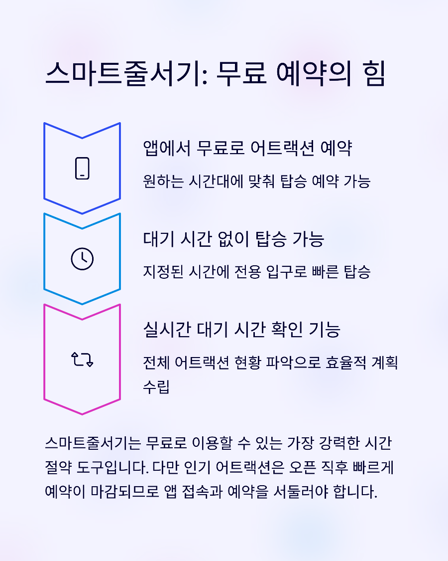 스마트줄서기는 큐패스와 같이 사용하면 진짜 신세계예요. 오전엔 큐패스, 오후엔 스마트줄서기 조합이 특히 좋아요. 타이밍만 잘 맞추면 대기 시간 없이 하루 종일 어트랙션을 즐길 수 있답니다. 😍