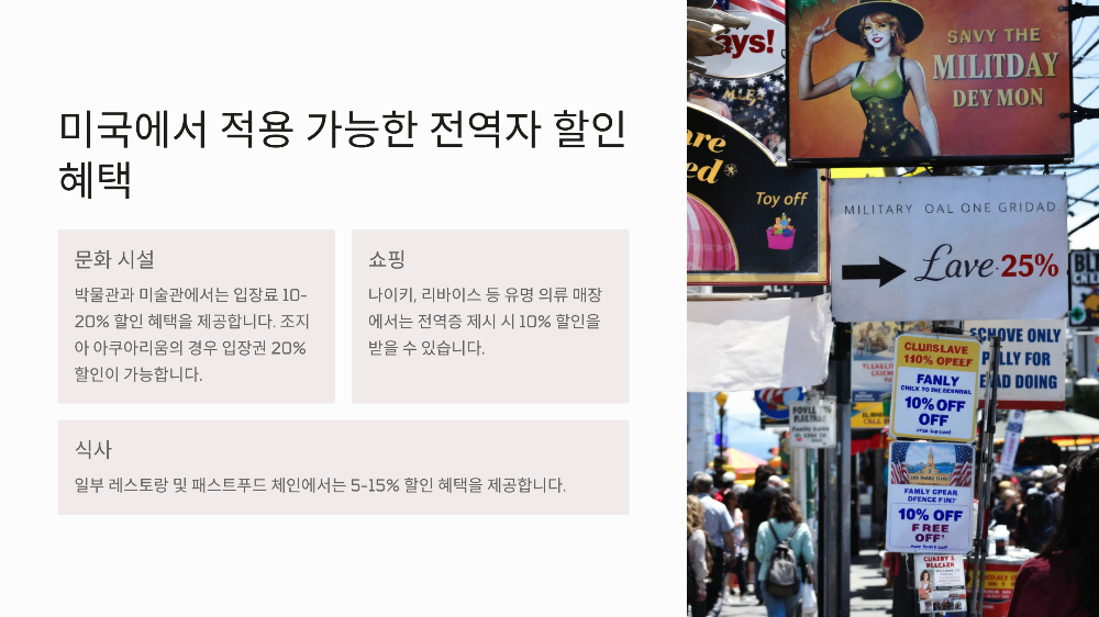 미국은 군인과 전역자에 대한 존경 문화가 강하며, 민간 기업도 다양한 Military Discount(군인 할인)을 제공합니다. 한국과 미국은 6·25 전쟁, 베트남전 등을 함께 치른 혈맹 국가로 인식되며, 일부 시설이나 기업에서는 외국 군인 출신에게도 동등한 혜택을 제공하고 있습니다.