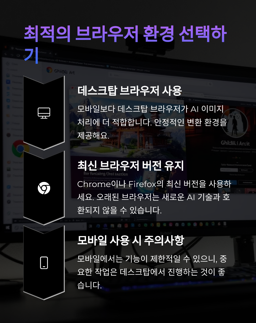 마지막으로는 모바일 환경에서의 문제도 무시 못 해요. 특히 Safari나 오래된 Chrome에서는 지브리 스타일 변환이 제대로 작동하지 않을 수 있어요. 가능하면 데스크톱에서 시도하는 걸 추천해요.