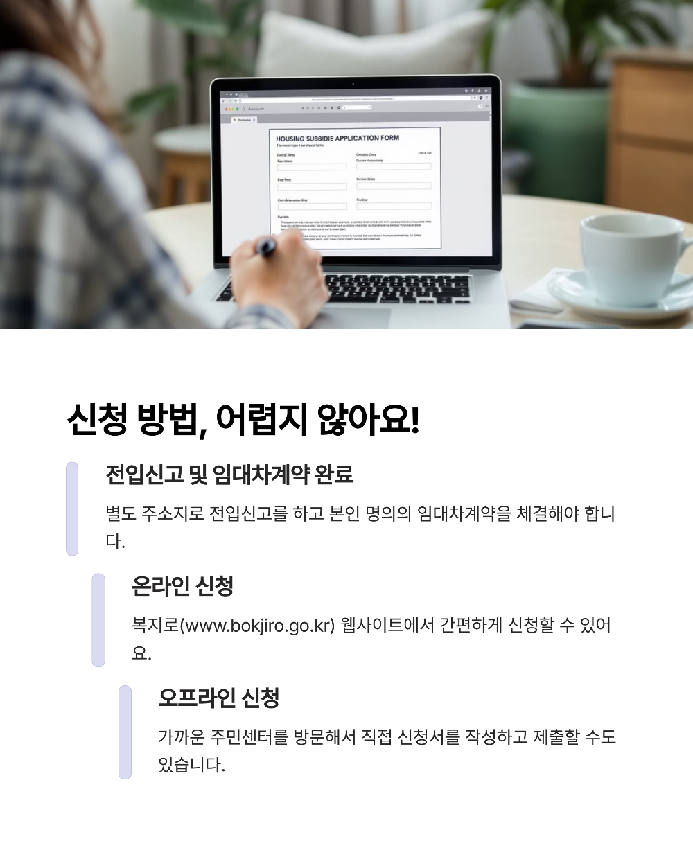청년 주거급여 분리지급 신청은 가구주인 부모가 직접 신청하는 게 원칙이에요. 청년 본인이 신청할 수는 없고, 부모가 주거급여 수급자여야 해요. 이 점은 많이 헷갈려하시더라고요.