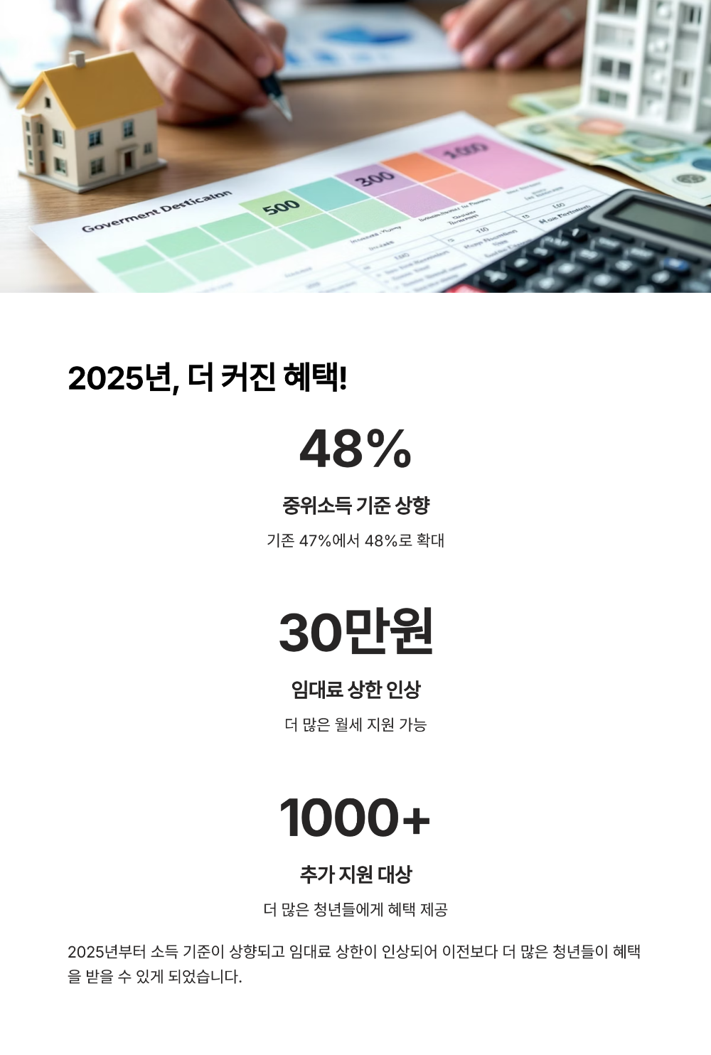 2025년은 확실히 청년들을 위한 주거복지의 변화가 두드러지는 해예요. 제도를 잘 이해하고 바뀐 내용까지 반영해서 신청하면, 더 많은 금액과 더 빠른 지원을 받을 수 있을 거예요 😊
