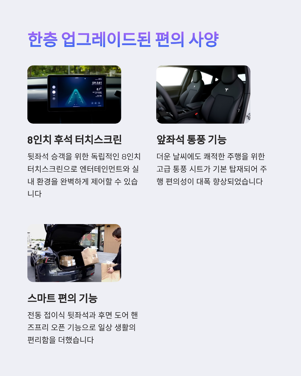 2025년형 모델은 페이스리프트 모델이지만, 가격을 그대로 유지하면서 더욱 실용적인 기능을 갖추고 있어 경쟁력이 뛰어나죠. 이제, 테슬라 모델Y 주니퍼를 합리적인 가격으로 구매할 기회를 놓치지 마세요!