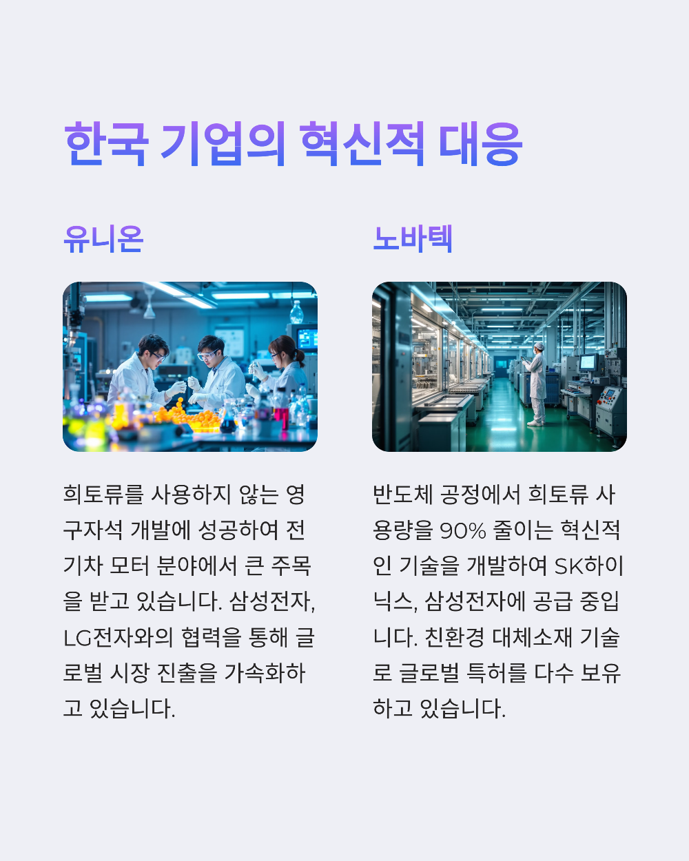 한국은 희토류를 직접 채굴하거나 정제하진 않지만, ‘대체소재 개발’과 ‘첨단 자석소재 기술’에서 경쟁력을 키우고 있어요. 바로 이런 점 때문에 최근 유니온, 노바텍 같은 기업들이 강하게 부각된 거예요.