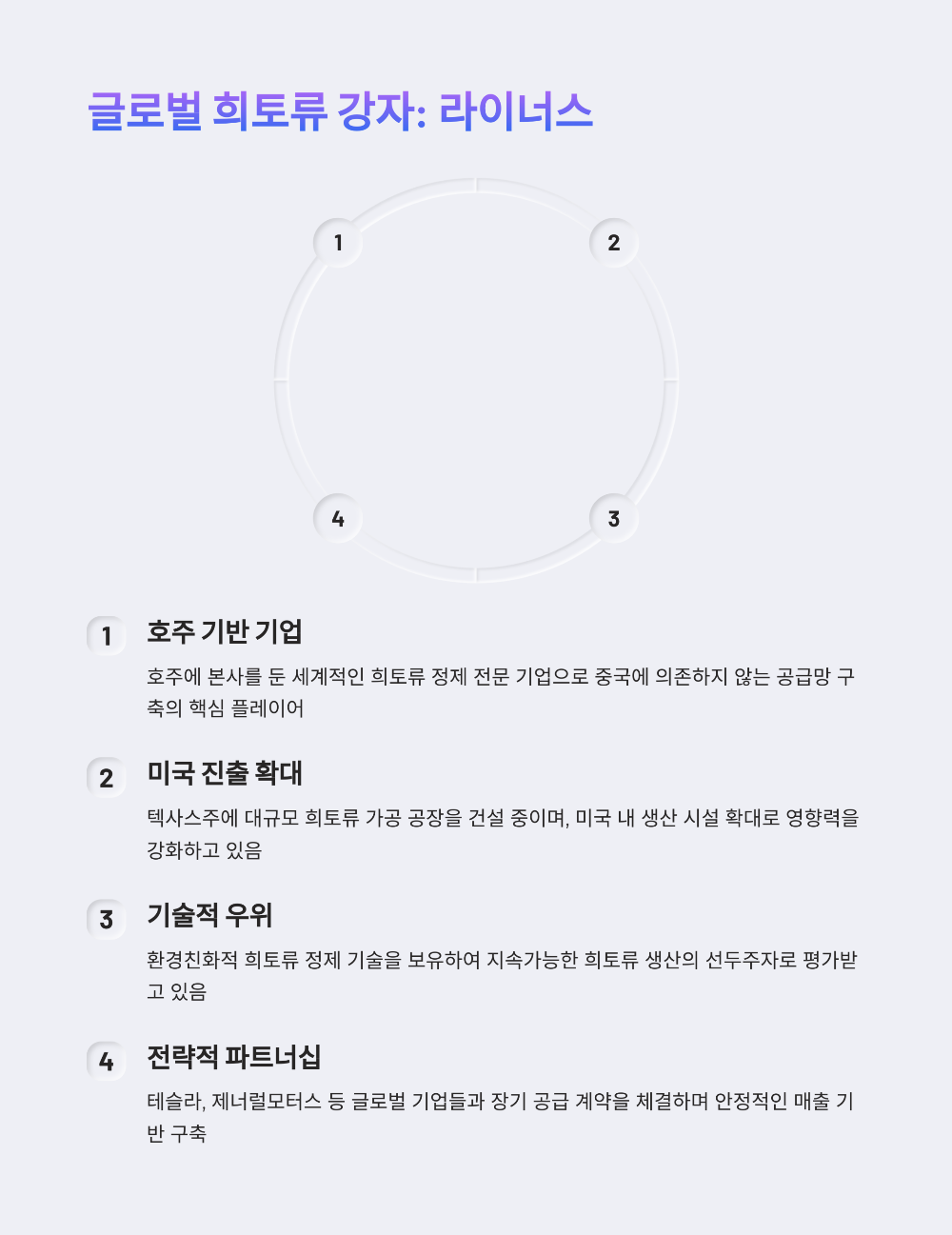 | 글로벌 공급망 다변화주 | 30% | 호주 알칼리나 리소시스(10%) 캐나다 퍼스트 마이너(10%) 브라질 베일 리소시스(10%) |