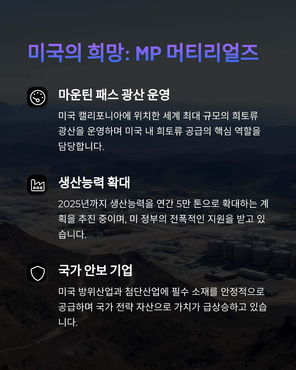 중국의 희토류 수출 금지 조치 이후, 미국 내 자원 자립이 최대 과제로 떠올랐어요. 그 중심에 있는 대표 기업이 바로 MP 머티리얼즈예요. 이 회사는 미국 캘리포니아주에 위치한 ‘마운틴 패스’ 광산을 운영하며, 미국 내 유일한 희토류 채굴업체로 꼽히죠.