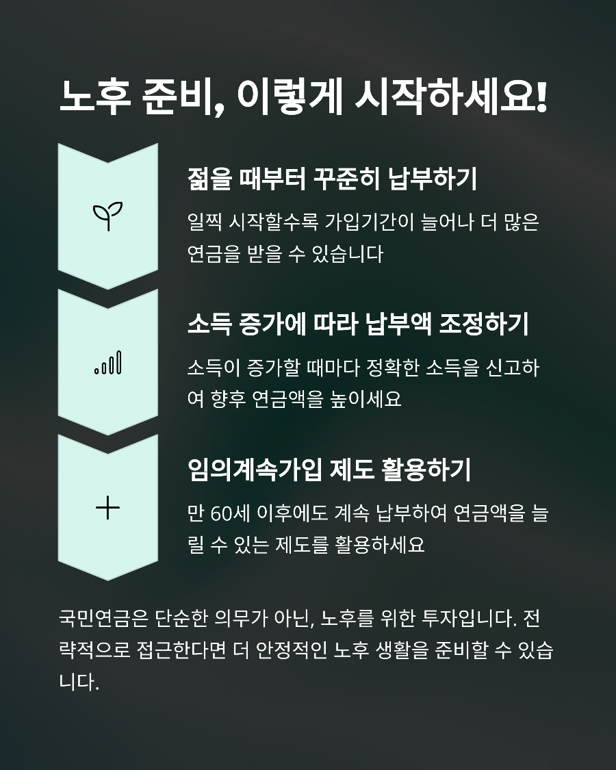 마지막으로 추후납부 제도도 있어요. 과거에 국민연금을 못 납부한 기간이 있다면, 이걸 나중에 추가로 납부해서 가입 기간을 늘릴 수 있어요. 특히 단기 가입자에게 효과적인 전략이에요!