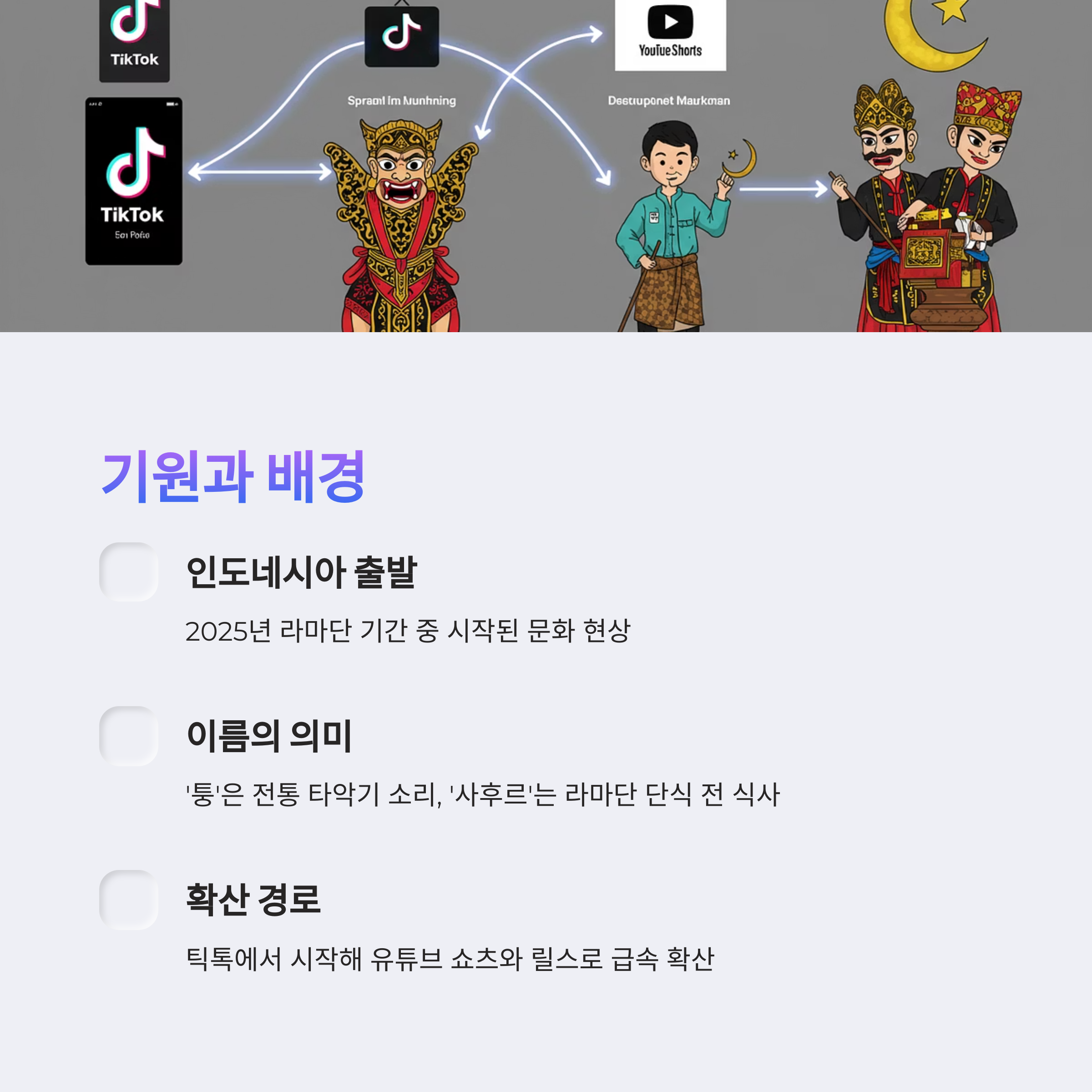 ‘퉁퉁’ 소리는 전통적인 인도네시아 슬릿 드럼의 타악음을 모사한 것으로, 사람을 깨우기 위한 사운드로 사용돼요. 그 덕분에 실제로 사후르 시간에 이 밈을 틀어놓는 유튜브 라이브도 등장했죠. 종교적 문화와 기술의 만남이라니, 참 흥미롭지 않나요?