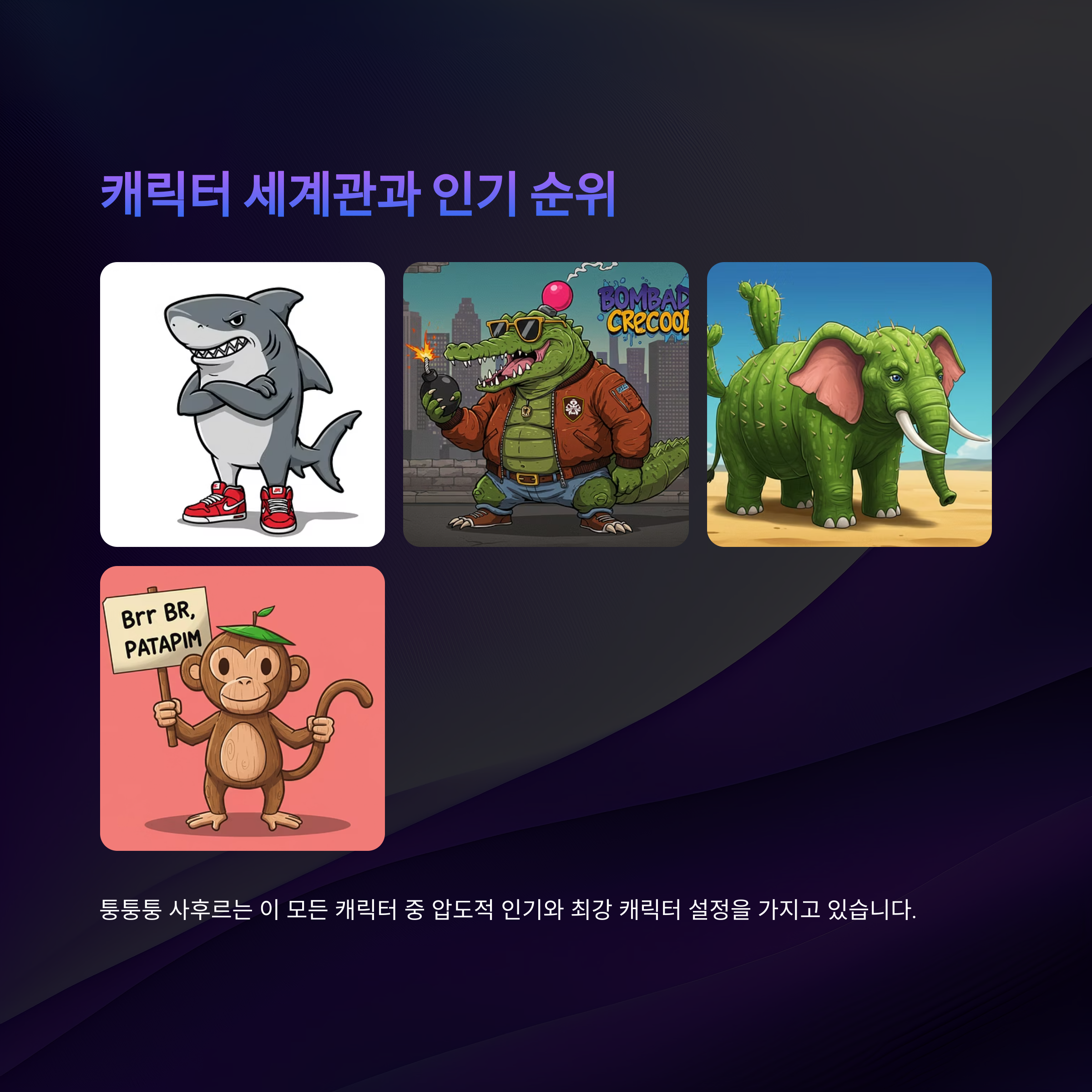 이제 마지막으로, 퉁퉁퉁 사후르와 함께 세계관을 구성하는 다른 인기 캐릭터들을 정리해볼게요. 어떤 괴물들이 이 세계에 함께 있는지 궁금하시죠? 👾