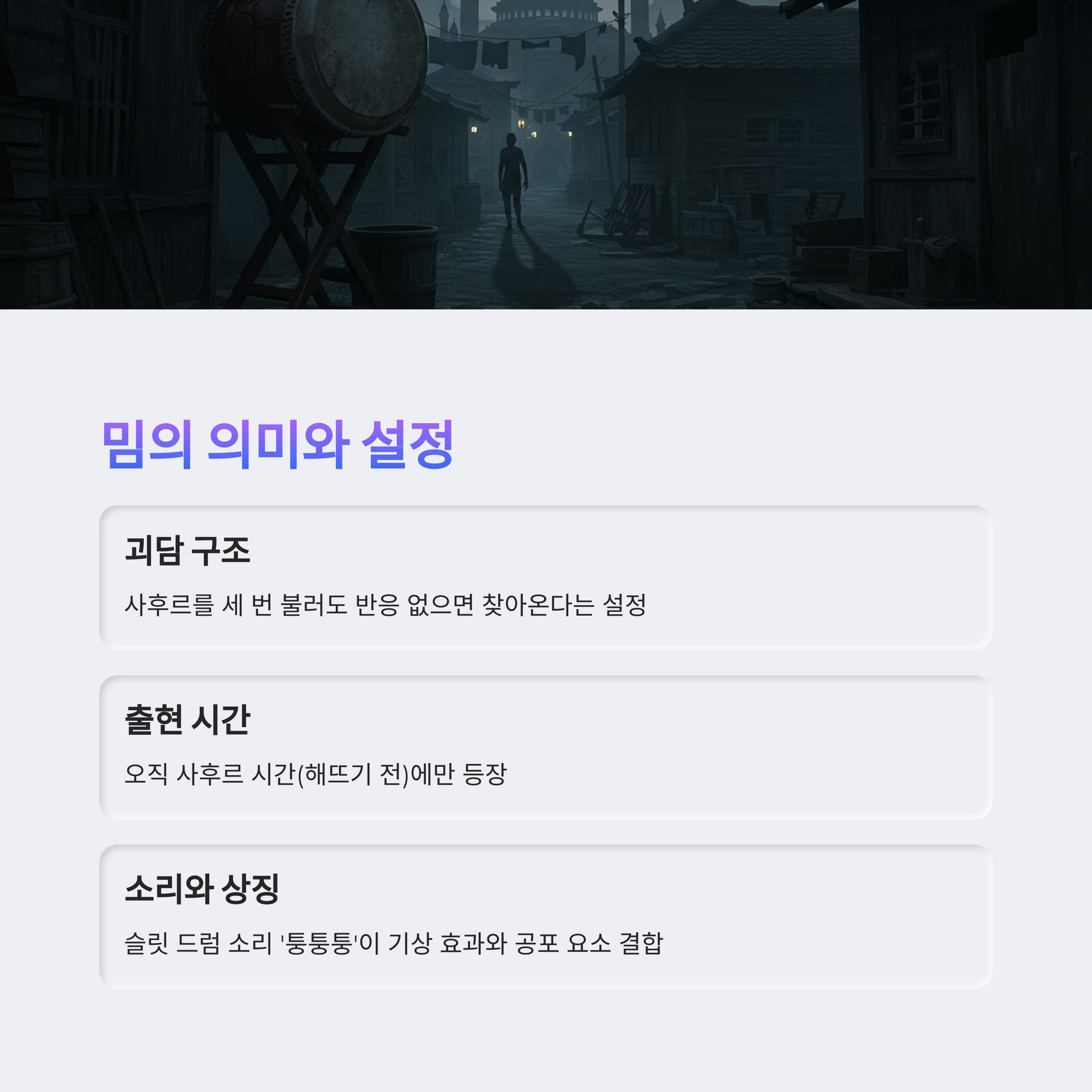 | 괴담 설정 | 사후르 세 번 불러도 반응 없으면 출몰 |