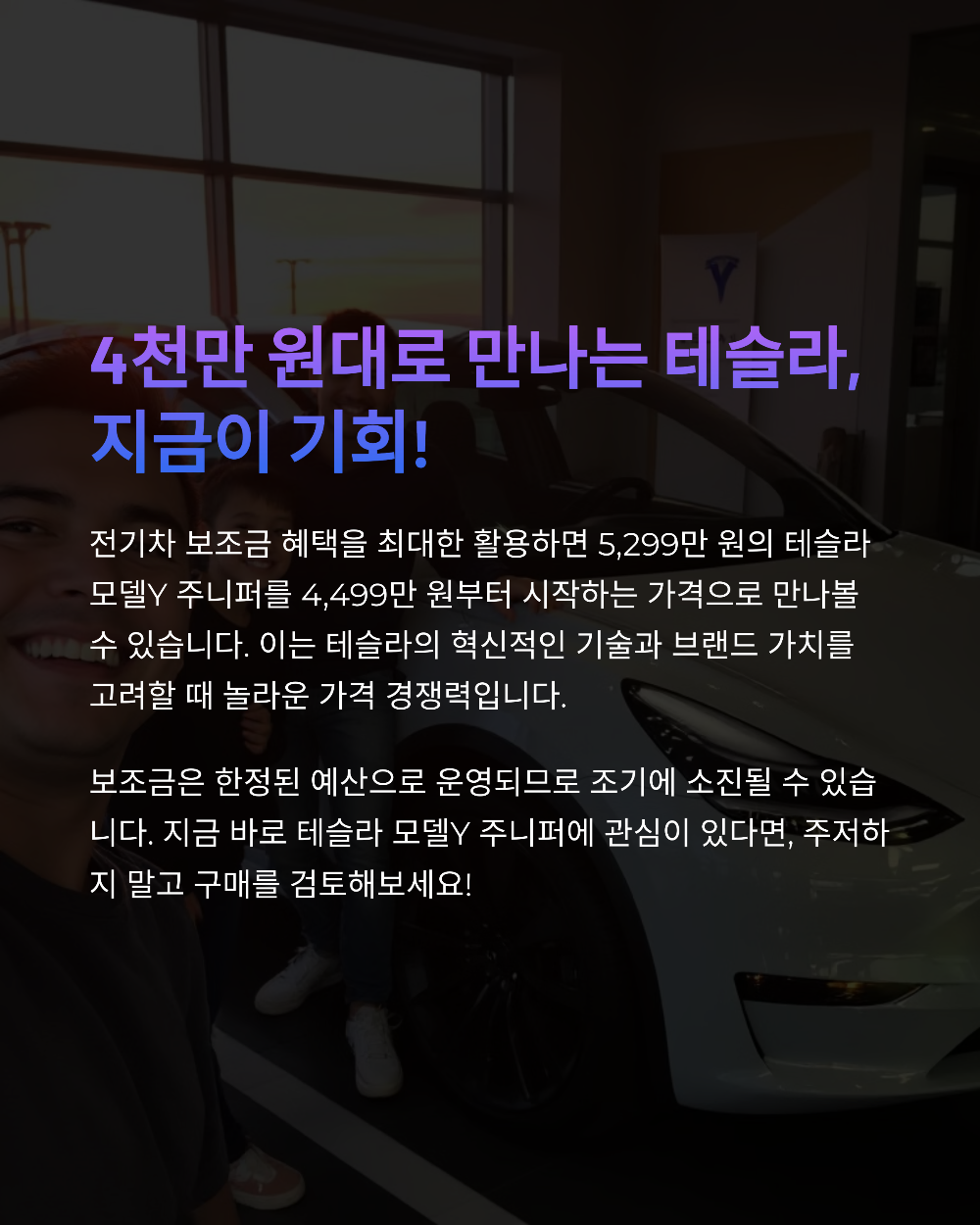 테슬라 모델Y 주니퍼는 보조금을 최대한 활용하면 4천만 원대 실구매가로 구매할 수 있어 상당히 매력적이에요!
