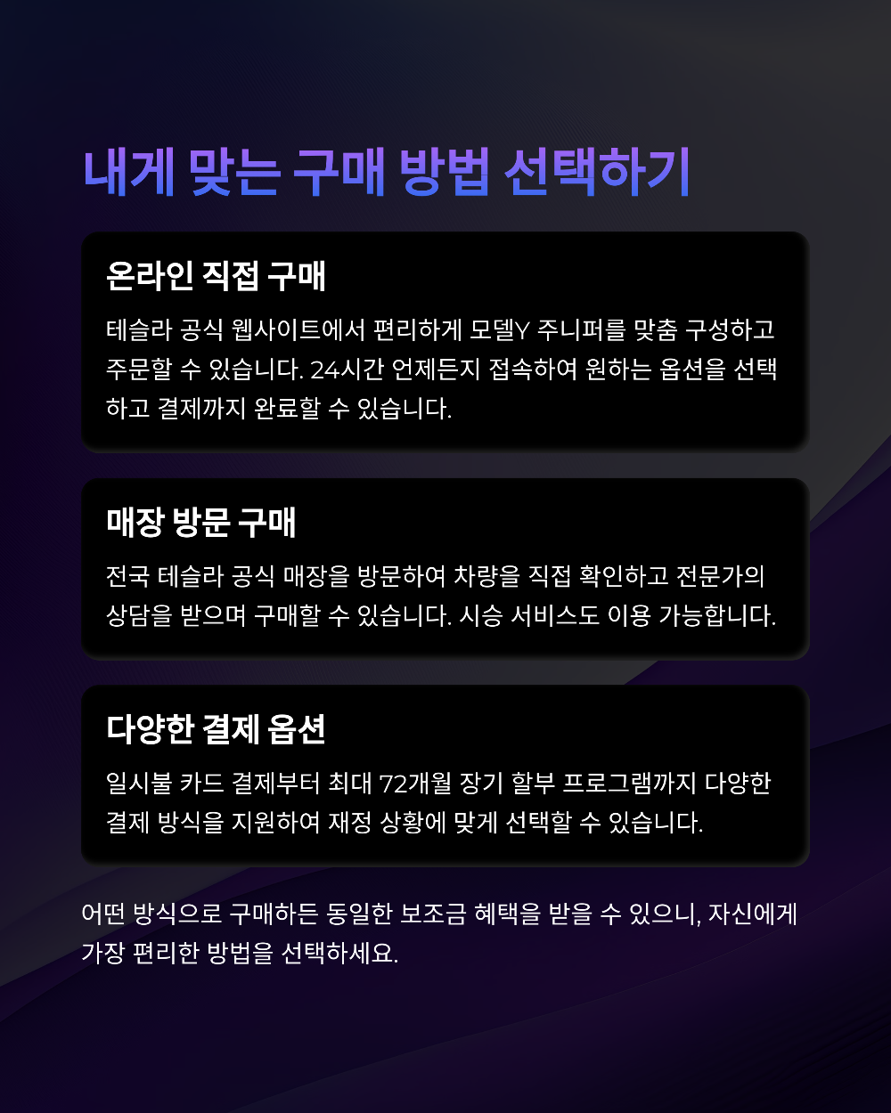 테슬라 모델Y 주니퍼는 온라인과 매장에서 구매할 수 있어요. 온라인으로 주문하면 빠르게 배송 일정을 확인할 수 있고, 매장에서 상담을 통해 즉시 구매도 가능하죠. 이때, 할부 결제나 카드 결제도 지원되기 때문에 결제 방법도 다양하게 선택할 수 있어요.