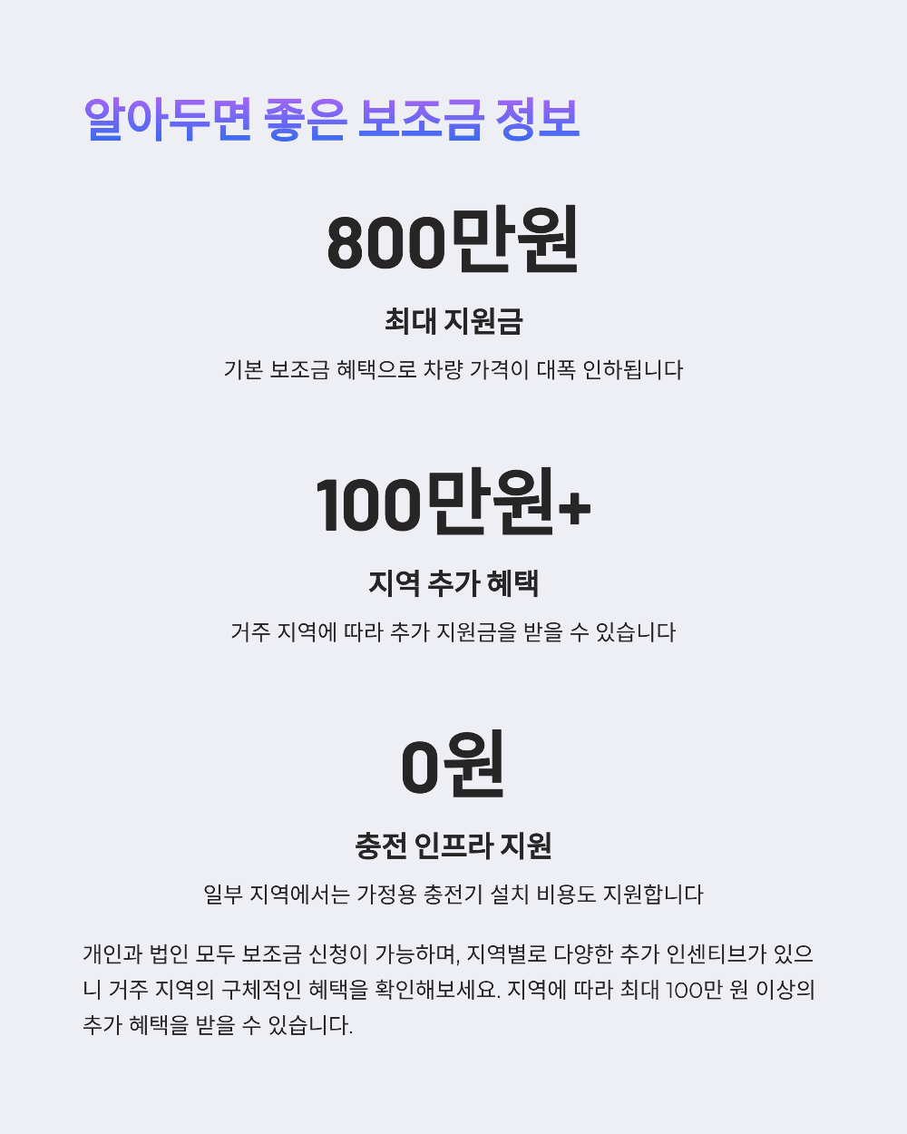 | 국가별 보조금 | 한국에서 최대 800만 원까지 지원 |