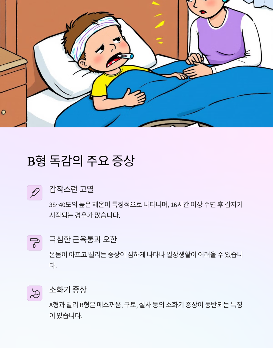 A1. B형 독감은 일반 감기보다 훨씬 고열과 근육통이 심하게 나타나요. 회복에도 더 오랜 시간이 걸리고, 합병증 위험도 높아요.