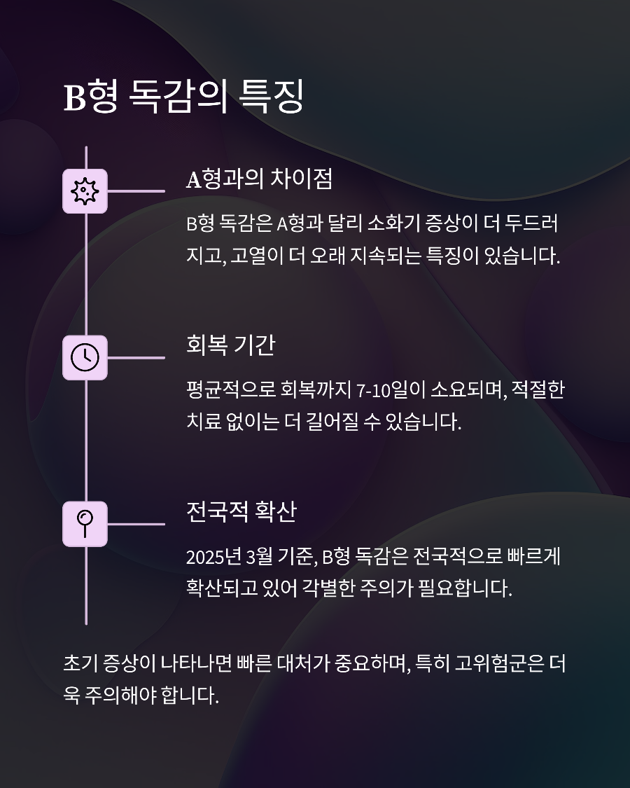 B형 독감은 A형과 비교했을 때 증상이 약하거나 단순할 거라고 생각하기 쉬운데요, 실제로는 전혀 그렇지 않아요. 특히 2025년에 유행 중인 B형 독감은 굉장히 독하고 증상이 다양한 편이에요. A형과는 다르게 변이가 적지만, 증상이 길고 예측이 어려운 경우가 많아요.